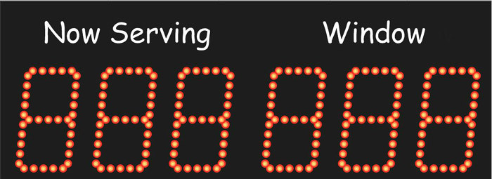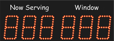 Six-Digit Take-A-Number Display, 5" High Digits, Red LEDs, Metal Frame, "Now Serving" and "Window" Labels.